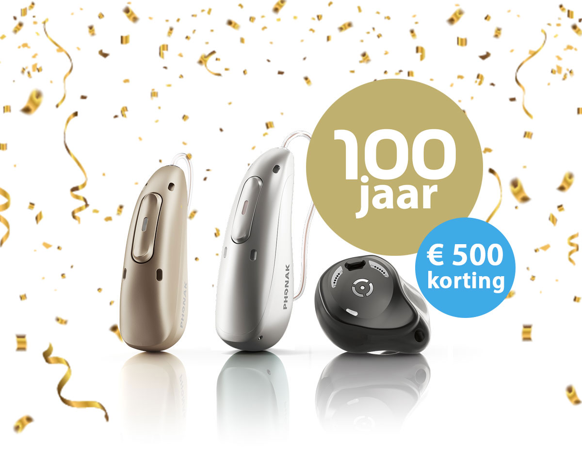 Maak kennis met de nieuwste generatie hoortoestellen: Phonak Infinio! Dankzij de geavanceerde technologie hoor je duidelijker en kost luisteren minder moeite. Neem vol vertrouwen deel aan elk gesprek: onderweg, op het werk of tijdens een drukke familiebijeenkomst. Omdat we 100 jaar bestaan krijg je tijdelijk maar liefst € 500 korting op een set.*